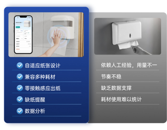 与此同时,依赖纸巾盒与人工补给的模式缺乏数据支撑,耗材使用难以统计、补给节点无法预判,浪费问题长期存在,却缺少有效的管理工具。这类“看不见的损耗”,正逐步成为美业门店服务标准化进程中的隐性短板。