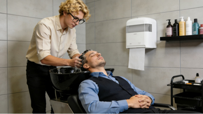 在理发店,是节奏感和专业感的双赢。 瑞沃智能感应分配器ZM-S64 自动感应出纸,无需裁剪、不必等待,帮助服务人员保持动作连贯,让服务流程更加干净利落。